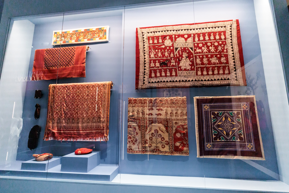 Большое количество экспонатов из коллекции ГМВ выставлено в зале, посвященном вышивке. В нем представлена одежда, созданная в небольших селениях, в кочевых и полукочевых общинах округа Кач западного индийского штата Гуджарат. В деревнях округа Кач вышивкой занимались женщины. Это искусство передавалось от матерей к дочерям, украшавших предметы быта и собственную одежду. Высочайшее мастерство нередко становилось источником дохода в суровых условиях очень жаркого и сухого климата Кача: наряды для торжественных случаев и ткани для ритуальных церемоний пользовались большим спросом. Веками развивались разнообразные этнические стили и методы ручной вышивки племенных подгрупп Рабари, Гарасия Джат, Мутва и других. Самыми характерными и оригинальными украшениями традиционных орнаментов стали мелкие кусочки зеркала или стекла различной формы, пришитые к ткани (абхла). Так декорированы два платья, рубашка для мальчика, шарф и текстильная ритуальная фигура слона. Одно из платьев особенно интересно – это роскошная женская туника аба (Абхо) середины 19 в., созданная женщинами общины Мутва, которые практикуют более восемнадцати различных стилей вышивки, выполненных крошечными стежками, строго симметричных и украшенных россыпью миниатюрных зеркал. Известно, что Мутва вышивали одежду махараджей.