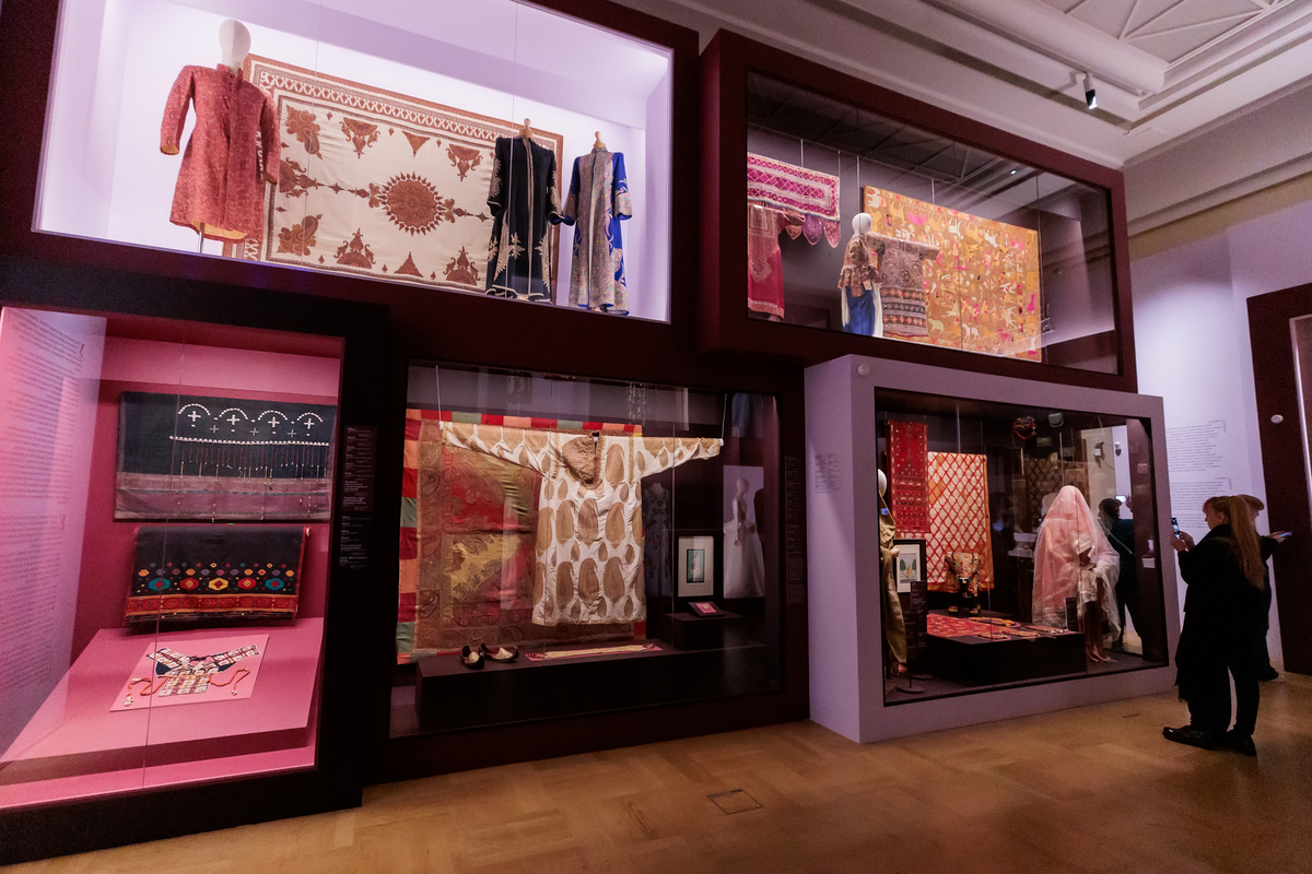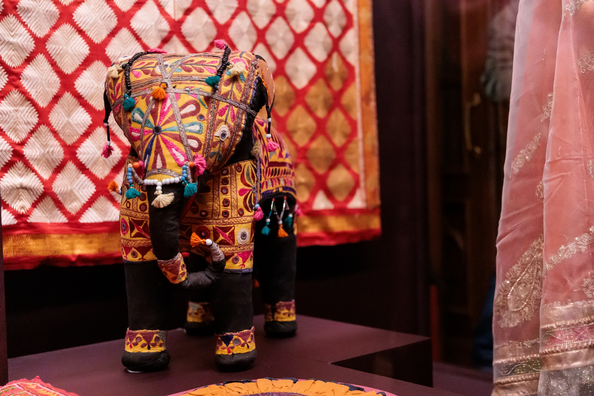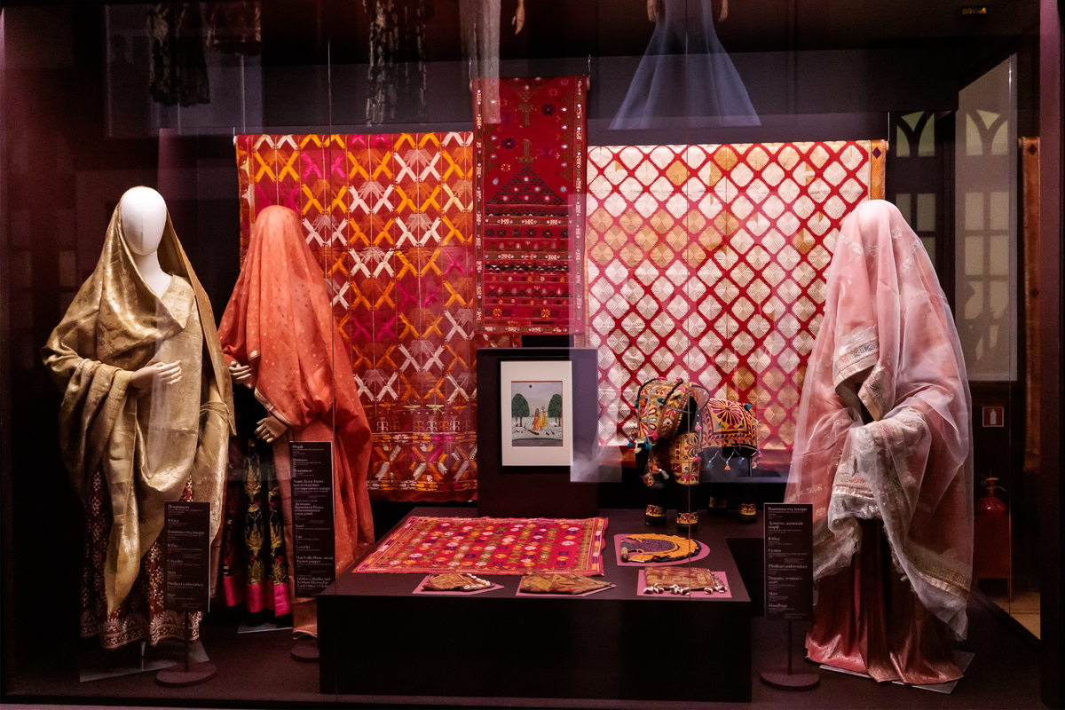 Большое количество экспонатов из коллекции ГМВ выставлено в зале, посвященном вышивке. В нем представлена одежда, созданная в небольших селениях, в кочевых и полукочевых общинах округа Кач западного индийского штата Гуджарат. В деревнях округа Кач вышивкой занимались женщины. Это искусство передавалось от матерей к дочерям, украшавших предметы быта и собственную одежду. Высочайшее мастерство нередко становилось источником дохода в суровых условиях очень жаркого и сухого климата Кача: наряды для торжественных случаев и ткани для ритуальных церемоний пользовались большим спросом. Веками развивались разнообразные этнические стили и методы ручной вышивки племенных подгрупп Рабари, Гарасия Джат, Мутва и других. Самыми характерными и оригинальными украшениями традиционных орнаментов стали мелкие кусочки зеркала или стекла различной формы, пришитые к ткани (абхла). Так декорированы два платья, рубашка для мальчика, шарф и текстильная ритуальная фигура слона. Одно из платьев особенно интересно – это роскошная женская туника аба (Абхо) середины 19 в., созданная женщинами общины Мутва, которые практикуют более восемнадцати различных стилей вышивки, выполненных крошечными стежками, строго симметричных и украшенных россыпью миниатюрных зеркал. Известно, что Мутва вышивали одежду махараджей.