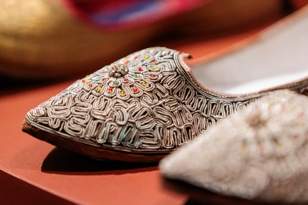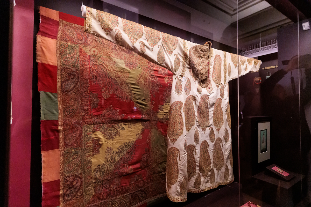 Цветовая насыщенность и сочность характерна для вышивок северных и центральных регионов Индии. В этих областях украшают сшитую одежду – рубахи и кафтаны разных форм, а также обувь и пояса. Традиционно здесь изготавливались вышивки – для знати, для богатых раджпутских и могольских семей, такие изделия рассчитаны на яркий солнечный свет, зажигающий краски и заставляющий сиять золото вышивки и ювелирных украшений. Традиционный индийский костюм полностью раскрывает свою красоту в жизни под небом, на открытом воздухе и много теряет в скупом северном освещении. Из собрания ГМВ на выставку предоставлены вышитые легкие пальто, расшитые золотными нитями и сверкающей канителью по коже и бархату головные уборы, пояса и туфли, а также старинная курта (туника), сшитая для очень обеспеченного придворного или, возможно, для махараджи. Длинная рубашка курта сшита из очень плотной, н в то же время тонкой и гладкой ткани, изготовленной из волокон дикого шелка. Вышивка выполнялась по сшитому изделию и большинство швов скрыто под узорами. Золотые нити, закрепленные на лицевой стороне ткани впикреп, образуют тонкие сияющие контуры, заполненные стежками блестящего шелка ярких цветов. Такой стиль вышивки напоминает инкрустацию из рубинов и изумрудов в ювелирной технике кундан – это уникальное ремесло индийских мастеров, которые укрепляли драгоценные камни в основе из хрупкого нефрита при помощи тонких листов золота.